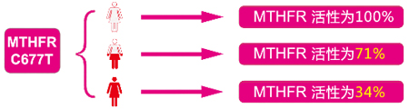 举例:MTHFR基因的C677T位点有CC、CT、TT三种类型, 其中677CC型对应的MTHFR活性为100%,677CT型对应的MTHFR活性为71%,而677TT型对应的MTHFR活性仅有34%[3]。