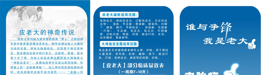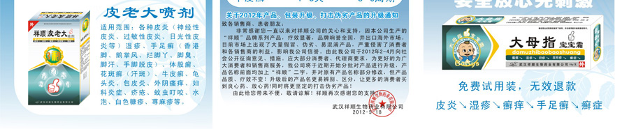 【产品名称】祥顺铍老大凝胶【批准文号】Q/WXS21-2009【产品规格】18克/支,铝管装。每件600盒【产品成份】白藓皮、狼毒、苦参、四片瓦、土茯苓、黄柏、樟脑、薄荷脑、冰片、七星剑、皂角刺、冬青、百部、七叶一支花、白花蛇草等多种中草药提炼而成。【功能主治】各种皮炎(神经性皮炎、过敏性皮炎、日光性皮炎等)、湿疹、 手足癣(香港脚、鹅掌风、烂脚丫、脚臭、脚汗、手脚脱皮)、体股癣、花斑癣 (汗斑)、牛皮癣、龟头炎、包皮炎、外阴瘙痒、妇科炎症、痔疮、疥疮、蚊虫叮咬、水泡、白色糠疹、 荨麻疹等。 1:1配试用装无效退款! 我是老大,谁与争锋!比疗效,比速度,比价格